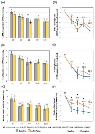 Colony-forming unit (CFU) counts of the (A) total microorganisms, (B) total streptococci, and (C) mutans streptococci on the composite surface (mean ± SD; n = 9). Different letters indicate significant differences between groups (p < 0.05). The difference in the log reduction between the baseline and aged samples concerning the (D) total microorganisms, (E) total streptococci, and (F) mutans streptococci is illustrated. * Asterisks indicate significant differences compared to baseline values before aging. (EC = experimental control; 3D = 3% DMAHDM; 5D = 5% DMAHDM; 3DN = 3% DMAHDM-20% NACP; 5DN = 5% DMAHDM-20% NACP).