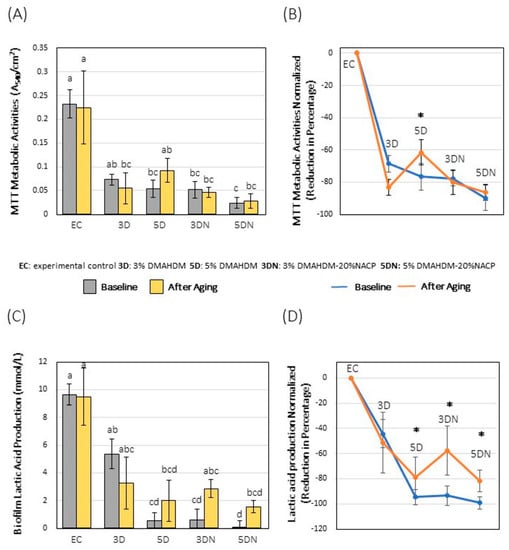 (A) The metabolic activities and (C) lactic acid production of the biofilms grown over the baseline and aged samples (mean ± SD; n = 9). Different letters indicate significant differences between groups (p < 0.05). The normalized data of the (B) metabolic activities and (D) lactic acid reduction in percentage. * Asterisks indicate significant differences compared to baseline values before aging. (EC = experimental control; 3D = 3% DMAHDM; 5D = 5% DMAHDM; 3DN = 3% DMAHDM-20% NACP; 5DN = 5% DMAHDM-20% NACP).