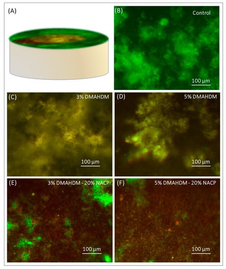 The live/dead images showed high quantification of viable microorganisms over the experimental control (Figure 5B). The incorporation of 3% and 5% DMAHDM into the composite formulation was associated with a mixture of viable and dead/compromised colonies (Figure 5C,D). Adding 20% of NACP to the DMAHDM was associated with the minor viable microorganisms (Figure 5E,F).