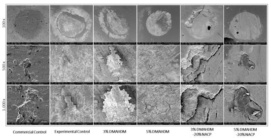 Following the simulated wear, a representative sample of each group was examined via scanning electron microscopy (SEM). The samples were mounted and gold-sputtered. The composites’ surface morphology was then visualized via SEM (Quanta 200, FEI Company, Hillsboro, OR, USA) with 3.5 kV. The representative images were taken at 100, 500, and 1000 × magnification.