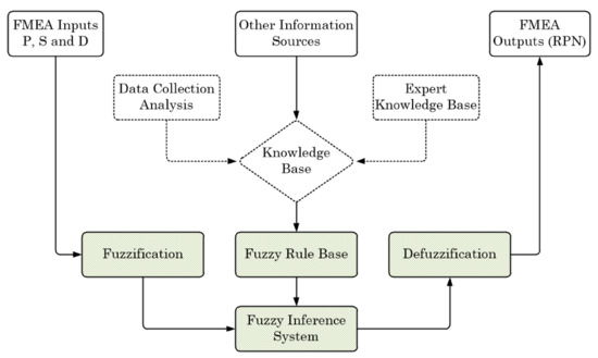 The developed fuzzy FMEA system follows a basic architecture of the fuzzy FMEA inference system consists of three main modules: input interface module (fuzzification), knowledge base module (rules base), and output interface model (defuzzification), as shown in Figure 1, adapted from [10].