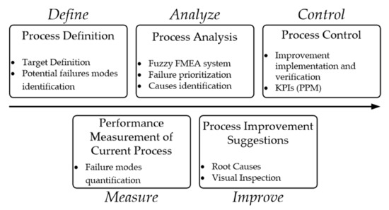In the proposed methodology the fuzzy FMEA system is implemented in the DMAIC cycle. Figure 2 summarizes the main aspects of the methodology.