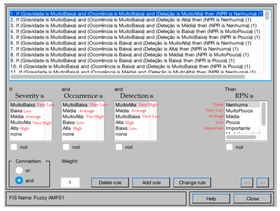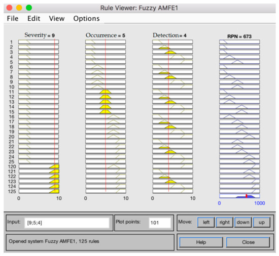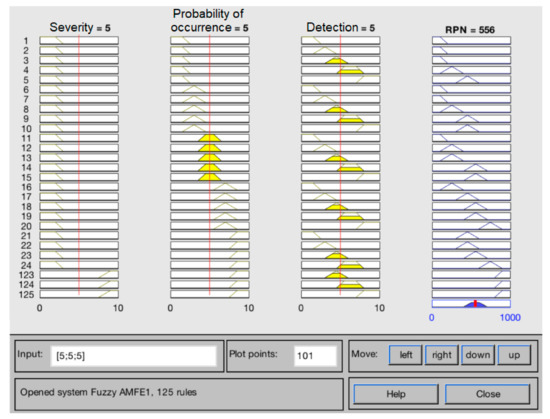 In Figure 4 we present the partial view of the fuzzy inference process for the fuzzy FMEA. On the left, the inputs S, O, and D are represented in Portuguese by “Gravidade”, “Ocorrência”, and “Deteção”. Based on the inputs, RPN is computed using the above explained combination operations. The final value for RPN is obtained using COG.