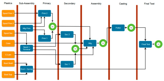 Process schematic of injection coil 1 production line. The representation by colors are as follows: all the machines on the production line, the plastic injection machines, where the plastic components that make up the part (orange), the assembly stations (Mtg), winding, casting, and final testing are molded (blue) and the visual inspection stations, where the operator inspects the parts or lots at the exit of the critical machines (green).