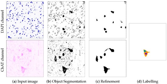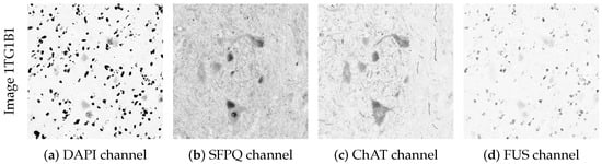 In Hagemann et al. [], the authors analysed the images in the ALS dataset using the information contained in the DAPI and ChAT channels only. Following the same approach, only those two channels were considered in the instantiation of the USRL schema, MagNoLia (named after Motor Neuron Labeller); The software tool is available for download from https://github.com/giaracvi/MagNoLia (accessed on 24 April 2020) under the Apache 2.0 License. For a better visualisation of the process, the representation of the output of each phase is presented and explored in Figure 5.
