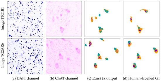 Since hand labelling in multi-class segmentation requires a huge amount of time, for the present work, we selected a subset of 90 representative images from the original ALS dataset. Each of these images was hand labelled by an expert, so as to generate hand-made, multi-class segmentations. These segmentations were used as the ground truth in the evaluation of the performance of ilastik and the USRL schema. In the remainder of this work, we refer to this dataset as the ALS-GT dataset, including the 90 tissue images and their hand-made segmentations. Figure 4 shows the channels DAPI and ChAT, respectively coloured in blue and magenta, for two images in the ALS-GT dataset, together with the segmentations produced by a human expert and ilastik. Ilastik was used as in the automated pipeline presented in Hagemann et al. [].