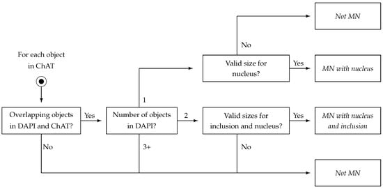 - Labelling phase: The LBL phase combines the refined objects in DAPI and ChAT channels into a single representation. The process is depicted in Figure 6. For each object detected in ChAT, a series of questions are made. First, an object in ChAT is only considered as a candidate if it overlaps objects in DAPI; this corresponds to the idea that each MN must contain a nucleus, and might also contain an inclusion. An object in ChAT is considered valid if (a) it overlaps with an object in DAPI and (b) at least 90% of the area of such an object in DAPI is coincident with the object in ChAT. Applying this condition, the candidate objects are first categorised as an MN candidate with a nucleus (just one object in DAPI within an object in ChAT) or as an MN candidate with a nucleus and inclusion (two objects in DAPI within an object in ChAT). This decision was not based exclusively on the number of objects. The size was used as the second cascading decision, as no nucleus or inclusion can take up more than half of the area of a cell; specifically, DAPI objects must be greater than 5% and smaller than 50% of the ChAT object it overlaps. Note that, if the cell is finally recognised as an MN, each of its parts is individually labelled according to the appearance of its organelles in each of the channels.