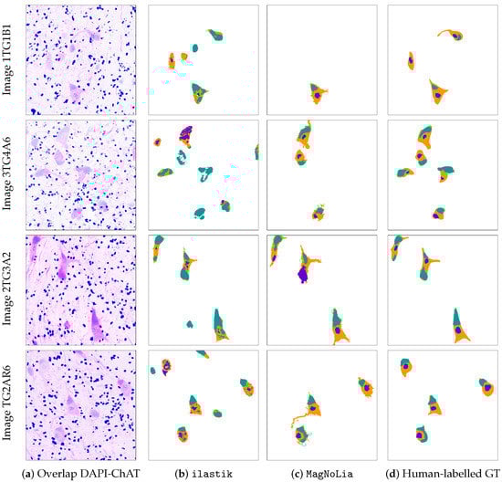 Visual representation of the output by ilastik, MagNoLia and human experts for four different images in the dataset. Each row contains the results for a single image. Column (a) displays an overlap of the DAPI (coloured in blue) and ChAT (coloured in magenta) channels; Columns (b–d) display the output by ilastik, MagNoLia and the human labeller, respectively. In Columns (b–d), teal pixels represent inclusions, orange ones represent cytoplasms and purple ones represent nuclei.