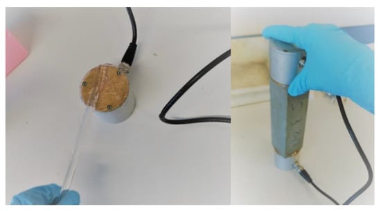 The determination of the propagation time and ultrasonic pulse velocity was carried out following the European Standard [19]. UPV was calculated according to the equation: