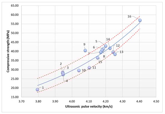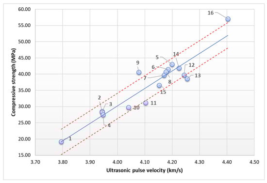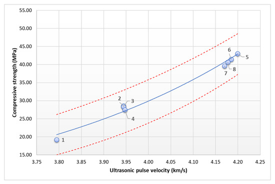 Presentation of the results of the compressive strength test concerning the calculated Ultrasonic Pulse Velocity of the natural mordenite. The blue dashed line represents the lineal trend of the values, and the red dashed lines represent the limits set with 95% confidence.