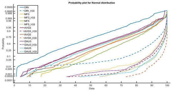 In order to collect more valuable statistical information, the proposed method transforms the image into a higher significant bit-plane based image by dropping least significant bits of each pixels and considering only the higher significant bits. The resultant image contains more relevant information in particular range that helps in generating more valuable information with difference arrays than the complete image. To study experimentally and analyze the effectiveness of the higher significant bit-plane based image, a normal probability distribution of pixel difference in the UCID database [36] having 1338 images is considered. The graph of the normal probability distribution is shown in Figure 2, where ORI denotes the non-filtered image, ORI_HSB denotes the higher significant bit-plane based image of ORI images. In general, the 8-bit grayscale image is considered by conventional image filtering detection techniques. However, 4-HSB version of images is considered in this paper. Median filtered image with filter size 3 × 3 and 5 × 5 are denoted as MF3 and MF5 and their corresponding higher significant bit-plane versions are denoted by MF3_HSB and MF5_HSB. In the same way, mean and Gaussian filtered images with filter size 3 × 3 & 5 × 5 are denoted as AVG3, AVG5, GAU3 & GAU5, respectively. It is evident from the Figure 2 that the higher significant bit-plane filtered images (MF3_HSB, MF5_HSB, AVG3_HSB, AVG5_HSB, GAU3_HSB, GAU5_HSB) contain a most of the information in small interval whereas the information is distributed into a large interval in normal images. Since the Markov chain is applied on thresholded arrays, the higher significant bit-plane images will perform better in the view of thresholding.