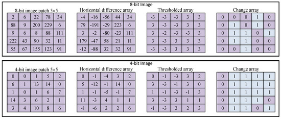 As discussed above, the Markov chain is applied on thresholded difference arrays to extract statistical information in compact array, the higher significant bit-plane images provides better information for feature sets without increasing the size of feature vector. The validation of performance benefits in the higher significant bit-plane images is illustrated in Figure 4. In the example, a 5 × 5 size pixels image patched from 8-bit image is considered as 8-bit image is commonly used for experimental analysis. The horizontal difference array of the image is further thresholded at threshold Γ = 3. To analyze the variation in information, the change array is constructed. The change array shows the change in the element value of column wise. Since the initial three values are −3 in the first row of thresholded array, there is no change and it is represented in the change array as 0. The fourth value in the first row of thresholded array is three. It means that the value is changed from −3 to 3. Therefore, the change is represented by one. The same analysis is performed on 4-HSB image of the same 8-bit image which is considered in the aforementioned case. It can be seen in the thresholded array and change array that shows better variation on 4-HSB image means that the statistical analysis performed on HSB image will demonstrate better filtering detection accuracy.