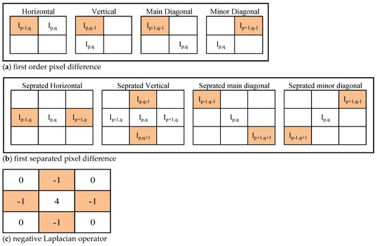 Pixel differences: (a) first order pixel difference; (b) separated pixel difference; (c) negative Laplacian operator.