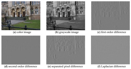 Image and their corresponding difference arrays: (a) color image; (b) grayscale image; (c) first order difference array; (d) second order difference array; (e) separated pixel difference array; (f) Laplacian difference array.
