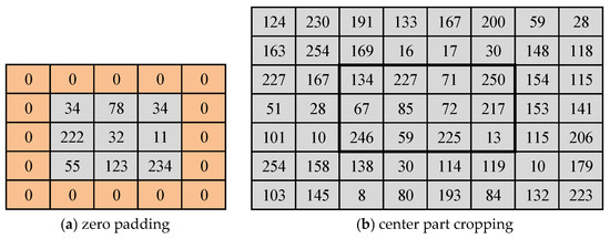 Padding and center cropping: (a) zero padding; (b) center part cropping.