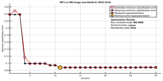 Both uncompressed and compressed images with JPEG quality Q = {70,50,30} and size of 128 × 128, 64 × 64, and 32 × 32 pixels are used for experimental purposes. The non-filtered images are denoted by ORI. Median filtered images with a filter size of 3 × 3 are denoted by MF3. Similarly, mean filtered and Gaussian filtered images of a filter size 3 × 3 are denoted by AVG3 and GAU3, respectively. Median, mean and Gaussian filtered images of filter window size 5 × 5 are denoted by MF5, AVG5 and GAU5, respectively. The compression is applied after filtering, i.e., post JPEG compression in filtered images. The SVM classifier with linear kernel is taken as a classifier. More than one hundred training testing pairs are formed for unbiased result analysis. Both the training and testing set have an equal number of images. The experimental results are represented in the form of average detection accuracy and average percentage error. For the proposed method, optimum SVM hyper-parameters are achieved using minimum classification error plot as shown in Figure 8. The estimated and observed minimum classification error point denotes the estimated and observed error while considering different hyper parameter values in the process of Bayesian optimization. The best hyper-parameter point denotes the iteration of corresponding optimized hyper-parameters. The minimum error hyper-parameters point defines the iteration of respective hyper parameters that produce the observed minimum classification error. The ORI and MF3 images of image sizes 64 × 64 and JPEG Q = 50 are taken for parameter selection. The hyper-parameters are utilized for all other experimental results in rest of the paper.