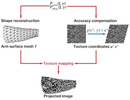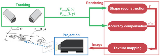 During tracking, arm poses including wrist pose P w r i s t and elbow pose P e l b o w are obtained by a marker-based motion tracking system in real time and used for rendering. Gray dots on the arm in Figure 1 indicate markers. During rendering, shape reconstruction outputs a 3D mesh of the arm surface based on the acquired real-time joint poses and predefined shape parameters, while accuracy compensation outputs the 2D texture coordinates of the arm model based on the joint poses only. These two processes are performed in parallel to accelerate rendering. The outputs are then combined by texture mapping to generate an image for projection. During projection, a high-speed projector shows the image on the arm of a user.