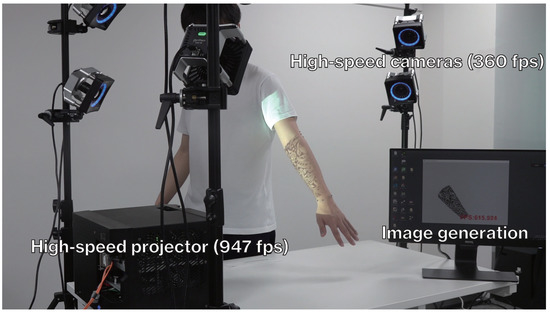 Projection mapping can also be performed on the human body, which is a complex non-rigid surface. For instance, accurate face projection mapping systems have been proposed [8,9]. Bermano et al. [8] achieved projection mapping onto a human face based on non-rigid marker-less face tracking. Sigel et al. [9] proposed the FaceForge system to improve the applicability and quality of face projection mapping using multiple projectors. Similarly, other parts of the human body can be augmented by projection mapping. Augmenting the human arm surface via dynamic projection mapping can notably improve applications related to activities of daily living. In addition, projection mapping has found applications in a variety of fields such as fashion [10,11], user interfaces [12,13,14,15], prototyping [16,17], education [18], and medical assistance [19]. For instance, Gannon et al. [16] presented ExoSkin, a hybrid fabrication system for designing and projecting digital objects directly on the body through projection mapping and marker-based joint tracking. Xiao et al. [12] introduced LumiWatch, a skin-projected wristwatch, to enable coarse touch screen capabilities on the arm surface. However, conventional projection mapping systems for the human arm surface mostly neglect skin deformation and have a high latency between motion and projection, consequently causing noticeable misalignments between the arm surface and projected images. These problems degrade the user experience and limit the development of more applications.