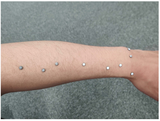 We determined Equation (1) in advance using polynomial curve fitting of user-specific data. Six markers for data collection were placed along the forearm discretely, as shown in Figure 6. The 3D position of i-th marker M i t at time t was obtained by the motion tracking system. The data were processed as follows: