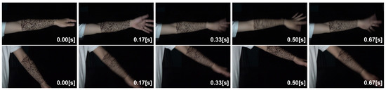 Herein, we propose a high-speed dynamic projection mapping system for the human arm with realistic skin deformation. The developed system achieves a latency of 10 ms between the motion and projection, almost imperceptible by the human vision even under high-speed rotations and translations, as shown in Figure 7. This is the first projection mapping system that can realistically handle human arm surfaces with a very low latency, although the achieved latency is still a few milliseconds higher than that reported in [20]. We believe that our system can be beneficial for applications in many fields such as fashion, user interfaces, and education. For example, it is difficult to remove a tattoo after getting tattooed; however, by using the proposed system, people can enjoy the realistic tattoo digitally and intuitively find their favorite tattoo design, as shown in Figure 8. On-body interfaces can become more flexible and interactive owing to realistic skin deformation and low latency as shown in Figure 9. Special-effect makeup, typically considered complicated and costly, can be easily applied in the film industry, as shown in Figure 10. Physiotherapy students can gain a better understanding by directly projecting the anatomical structures on the body.
