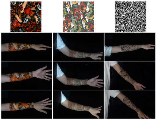 Figure 8. Proposed system projecting tattoo images (first row) onto the forearm surface under skin deformation (second to fourth rows).