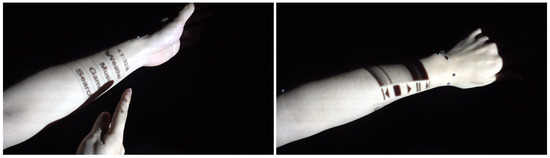 Figure 8 presents an example of tattoo image projection on the forearm with varying skin deformation using the developed system. The projected image can be selected by the user freely and is deformed realistically as the wrist and elbow joints rotate. The developed system can also enable flexible on-body user interfaces because both sides of the arm surface can be used. In the left photograph of Figure 9, the inner side of the forearm serves as a menu panel, and, in the right photograph, the outer side of the forearm serves as a music player interface. Figure 10 presents another example of wound effects using a physical-based rendering texture.