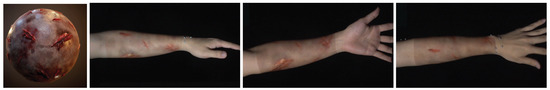 Figure 10. Wound generated with physically based rendering texture (first column), wound effect projected on the forearm (second to fourth columns).