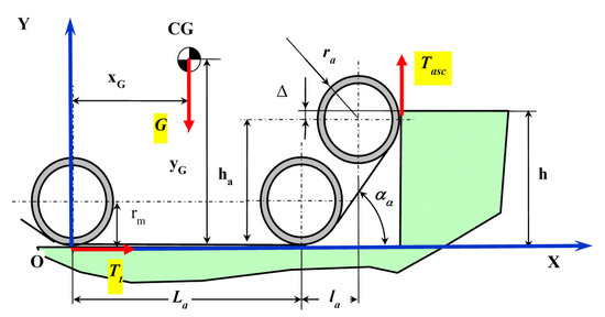 where: CG—weight center; —distance from the CG to the running surface, on the axle Oy; —drive wheel radius; —the radius of the tension roller; —distance from the axis of the tension roller to the tread, on the axis Oy; —the angle of inclination of the ascending branch of the track to the axis Ox; —distance from the CG to the axle of the drive wheel, on the axle Ox; —the distance from the axle of the drive wheel to the last roller, the one at the beginning of the ascending branch of the track, on the axis Ox; —distance from the center of the last roller to the center of the tension roller, on the axis Ox.
