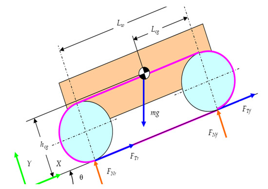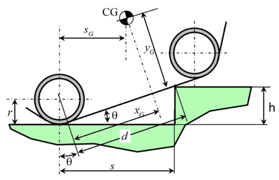 where: —the height of the obstacle step, on the axis Oy; —the difference between the height of the step obstacle and the height of the axis of the tension roller, on the axis Oy; —the distance from the axis of the drive wheel to the CG, along the longitudinal axis of the robot; —the distance from the CG to the axis of the tension roller, along the longitudinal axis of the robot; —the angle of inclination of the longitudinal axis of the robot with respect to the axis Ox.