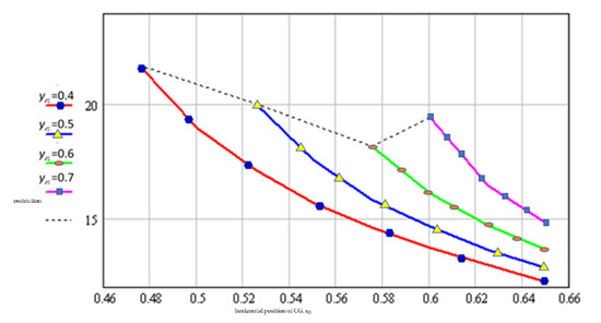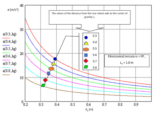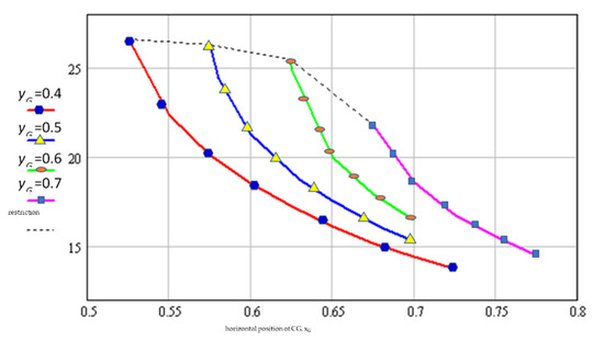 Eliminating the unknown φ, the width of the ditch that can be crossed was calculated according to the horizontal position of the center of mass and using the notation , the results shown in Figure 12 are obtained.