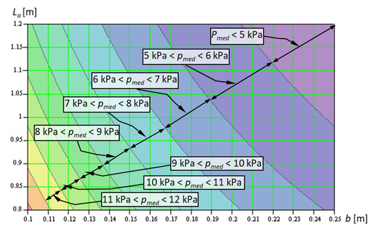 In Figure 13, it can be naturally concluded that the area located in the upper right, for which , is the most advantageous. An average–low ground pressure can be obtained by increasing the adhesion length and/or by increasing the track width.