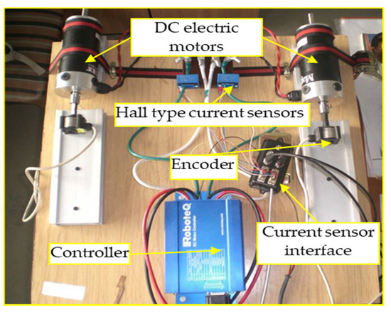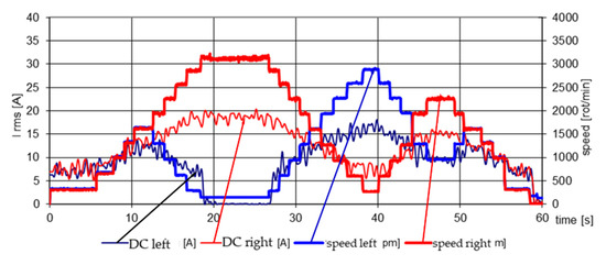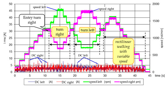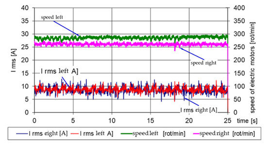 When operating during the test, the current absorbed by the motors, corresponding to a speed regime close to the maximum speed, was suspended at 18–20 A rms. Thus, regardless of the speed regimes, when driving in a straight line and/or in a corner, as well as for both directions, no warm-ups of the motors or reducers were found. The temperature of the MOSFET power components in the controller exceeded the ambient temperature by 1–2 °C. The values of the absorbed current represent 12–15% of the maximum current allowed by the controller.