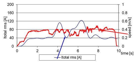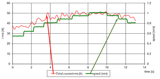 An example of data recorded at rectilinear displacement at maximum speed is shown in Figure 41. It is noted that, although the displacement speed was approximately constant (red line), the current shows significant variations due to the corresponding change in the overall resistance coefficient to advance.