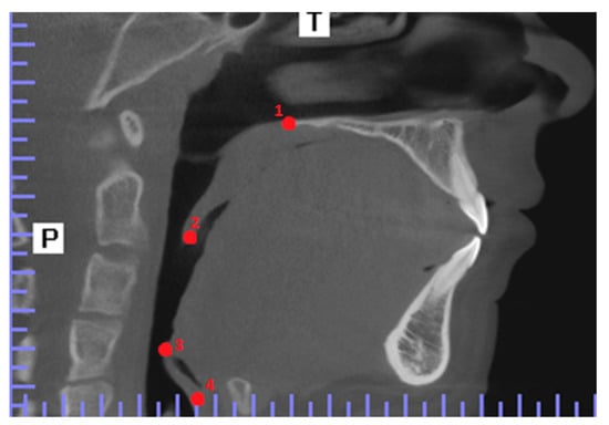 Landmarks used in CBCT analysis: posterior nasal spike (1), the tip of the uvula (2), the top of the epiglottis (3), the base of the epiglottis (4).