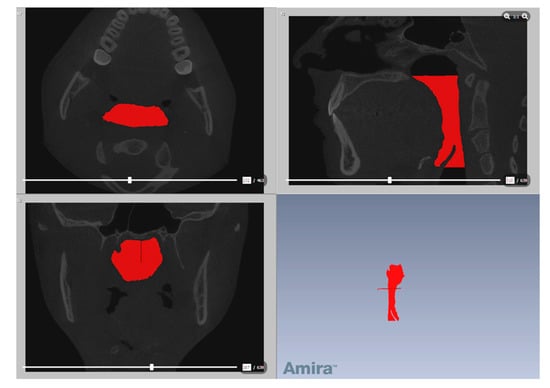 In addition, each patient was referred for cone beam computed tomography (CBCT, iCAT, Imaging Sciences, Hatfield, PA, USA, FOV: 16 × 13 cm, 0.25 mm voxel, scanning time 26.9 s). All CBCT scans were acquired by the same calibrated examiner to ensure the repeatable conditions, including head and tongue posture [22,23]. Every patient’s data obtained from CBCT scans were then uploaded into the 3D Amira™ visualization and analysis computer program (Thermo Fisher Scientific, Berlin, Germany) and set on cephalogram shot to calculate upper airway volume (UAV). Four landmarks were used, such as posterior nasal spike, the tip of the uvula, the top of the epiglottis, and the base of the epiglottis. The program marked the airways from which the upper airway volume was extracted (based on the landmarks). Mapping from 2D to 3D through interpolation was made to receive the volumetric measure automatically. The details, including landmarks used in the measurements and upper airway volume view in Amira are presented in Figure 1 and Figure 2.