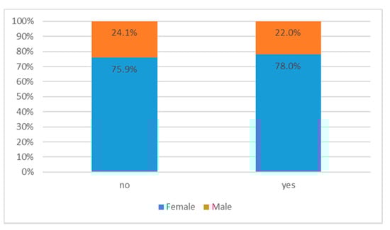 The mean age in the women’s group was 43.78 ± 12.89 years and in the men’s group, 45.37 ± 17.41 years. The average BMI in the women’s group was 24.58 ± 4.27, the average BMI in the men’s group was 26.08 ± 3.43 (Table 1). In response to question 1 of the Berlin Questionnaire (Do you snore?) 69 patients answered “yes” (54 females, 15 males), 47 (32 females, 15 males) “no”, and 13 patients did not know if they snored (13 females). We did not find gender-related risks of developing OSA (Figure 4). Patients who reported snoring also reported increased fatigue after waking up, as well as increased daytime sleepiness, compared to non-snorers who answered, “I am never or nearly never tired during the day”. Significantly higher BMI scores (26.14 ± 4.03 vs. 23.75 ± 3.87) were observed in declared snorers compared to non-snoring patients (Figure 5). In addition, snoring patients had higher Heart Rate (74 bpm vs. 68 bpm), higher modified Mallampati score (3 vs. 1) and lower UAV (13,241.4 vs. 17,627.4 vx) than the non-snoring group. Further analysis showed that snoring affects men and women equally. There were significant differences in blood oxygenation in snoring compared to non-snoring patients—98 vs. 99. In our study, breathing-related problems coincided with BMI ranging from 16.60 and higher, MMP 3 and 4, also UAV value from 5411.78 to 28,337.90 mm3. Additionally we found significant correlation between MMP scale and UAV (Tau = 0.17, p = 0.02).