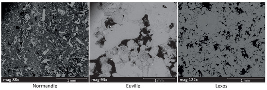 Figure 1. Images obtained by SEM: Normandie (left), Euville (middle) and Lexos (right).