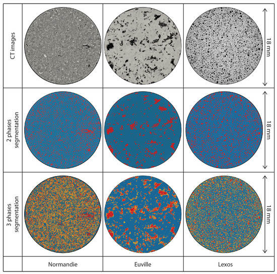After image acquisition, treatments were made before computing rock parameters. They were carried out on a homemade imaging software, previously developed and used [43]. Filters to smooth the pixels histogram (mean filter) and to correct brightness were applied to improve images quality. Then, a segmentation based on a region growing method was used to isolate the void phase of the image. In mono-mineral media, two or three phases are usually observed: the void phase (which can be divided into the macropores phase and the micro-phase, composed of micropores and micro-grains) and the matrix. The macropores phase is composed of pores larger than the pixel size while the micropores and micro-grains smaller than the pixel size are part of the micro-phase. In this study, as previously shown in Figure 1, Normandie has smaller pores than Lexos, which has smaller pores than Euville. In Figure 2, a 2D slice of each rock type is shown. The three structures are very different: Normandie presents a lot of micropores, Euville displays heterogeneous macro-pores, while Lexos shows some homogeneous macro-pores with micropores around. The software used can only display a two-phase segmentation. One phase is composed of macropores (pores larger than the pixel size) while the other phase is considering to be matrix. This segmentation gives a porosity based on macropores, labeled ϕ m a c r o , which is consequently largely underestimated. However, adding micropores (pores smaller than 12 m) with macropores will induce the incorporation of micro-grains into the void phase, and the corresponding porosity ( ϕ t o t a l ) will be consequently overestimated. Calculations have been made on images segmented with the macro-porosity. In order to obtain a consistent segmentation, the macro-void porosity has been correlated with the porosity from the centrifugation calculations. The pores proportion with a diameter smaller than 12 μm allow us to know the proportion of the porosity which is not visible on the images.