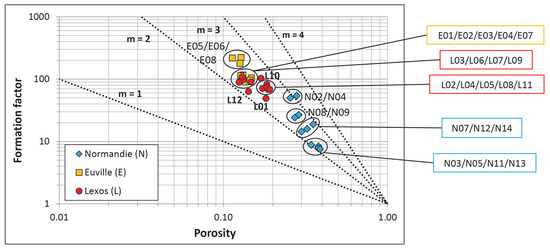 Figure 3. Crossplot of formation factor over porosity depending on the rock type. Diamonds are for Normandie, squares for Euville and circles for Lexos. Lines of equal cementation factors according to Archie’s law (Equation (5)) are also displayed.