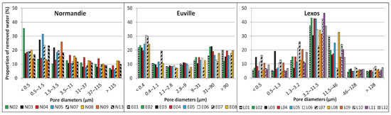 Figure 4. Pore diameters distribution from the centrifugation measurements. Results for Normandie samples are on the left, Euville in the center, Lexos on the right.