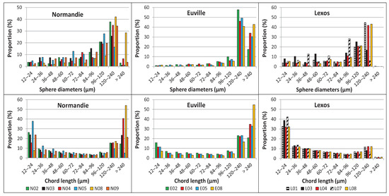 Figure 5. Pore size distribution obtained by sphere diameters calculations (on the top) and mean chord lengths calculations (on the bottom), using imaging software. Normandie samples are displayed on the left part, Euville on the central part and Lexos is shown on the right.