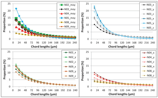 Figure 6. Chords length distribution for Normandie samples, pore diameters are displayed by proportion. On the top left, an average of chord lengths in the three directions is shown. The rest detail chord lengths in directions X, Y and Z: on the top right, there are N03 and N05, on the bottom left, N02 and N09, while on the bottom right, there are N04 and N08.