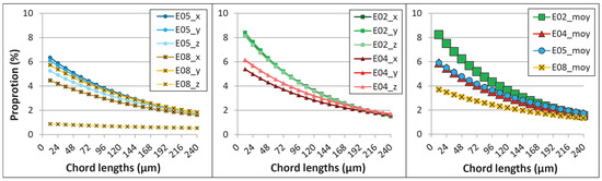Figure 7. Chords length distribution for Euville samples, pore diameters are displayed by proportion. On the left, an average of chord lenghts in the three directions is shown. On the middle and right, chord lengths are detailed in directions X, Y and Z: E02 and E04 on the middle and E05 and E08 on the right.