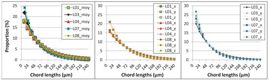 Figure 8. Chords length distribution for Lexos samples, pore diameters are displayed by proportion. On the left, an average of chord lenghts in the three directions is shown. On the middle and right, chord lengths are detailed in directions X, Y and Z: L01, L04 and L08 on the middle, and L03 and L07 on the right.