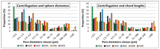 Groups formed inside each rock family overlap, from laboratory measurements and XRMT calculations. Indeed, in the Normandie set, N03/N05 couple has been constituted from both methods. This group presents high porosities and low electrical parameters from laboratory measurements, while relatively low permeabilities from XRMT. It also has a high proportion of small pores, which do not participate to the main flow, and is consistent with relatively low percolating volume P V and S V , while high f. Then, N02/N09 and N04/N08 formed two groups that can be gathered in one. These samples have relatively low porosities and high electrical factors from laboratory measurements, while high permeabilities from XRMT. They count a relatively low proportion of pores smaller than 10 μm, which comes with a high P V and S V , while a low f. In Figure 9, pore diameters distributions from both laboratory measurements and XRMT calculations are displayed on a similar graph. Data from centrifuge are more precise for pores smaller than 30 μm because large pores are more likely to empty before the experiment starts. Concerning XRMT calculations, only pores larger than a pixel are taken into account for calculations, then data is more precise for pores larger than two pixels, i.e., 24 μm. Therefore, in Figure 9, classes up to 30 μm are data from centrifuge and classes up to 30 μm are data from XRMT calculations. The previous mentioned groups are consistent with whatever the method used.