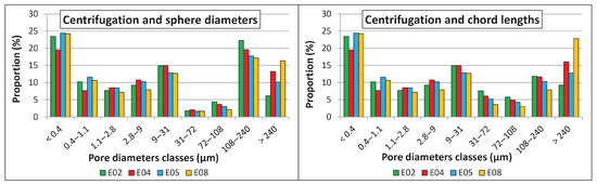Figure 10. Pore diameters distributions from laboratory and XRMT calculations for Euville rock type. Distribution from centrifugation and sphere diameters analysis is displayed on the left, while distribution from centrifugation and chord lengths analyses is shown on the right.