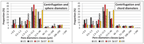 Figure 11. Pore diameters distributions from laboratory and XRMT calculations for Lexos rock type. Distribution from centrifugation and sphere diameters analysis is displayed on the left, while distribution from centrifugation and chord lengths analyses is shown on the right.