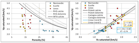 Moreover, V p and V s are related in a same equation with a positive correlation [52,53], where if one increases, the other follows (Figure 12 right). These equations fit the chalk and limestone samples, contrary to dolomite ones. Pickett’s equation stated V p = 1.9 V s for limestones, while our data set gives V p = 1.33 V s (with R 2 = 0.74 ) for Normandie and V p = 1.82 V s (with R 2 = 0.86 ) for Euville samples. The last one is therefore correlated with Pickett’s equation, while Normandie gives a remote result, probably due to its high proportion of small pores. However, Lexos samples present a significant number of variations due to the complexe structure of dolomite, and those two equations do not seem appropriate for our data.