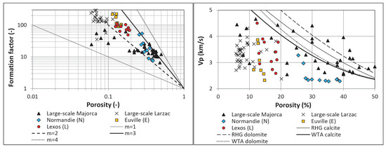 The evolution of formation factor F, porosity and P waves velocities V p with depth in Majorca illustrate that formation factor F and P waves velocities V p increase with decreasing porosity. This has also been observed on our pore-scale data, following well-known trends previously mentioned [46]. Then, large-scale properties compared with our dataset present some similarities and disparities (Figure 13). For a similar porosity, formation factors are on the same order of magnitude with very similar values. Data from Majorca experimental site are similar to Normandie data, which are both chalks; while Larzac data are similar to Euville data, which are both detrital limestones. However, for similar porosity, V p from chalk are higher for large-scale measurements than for laboratory ones, and are then closer to the RHG and WTA curves [50,51]. For detrital limestones, the same values of V p occur for lower porosity.