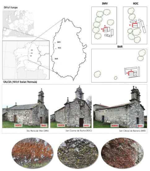 - Carballal, R.; Paz-Bermúdez, G.; Sánchez-Biezma, M.J.; Prieto, B. Lichen colonization of coastal churches in Galicia: Biodeterioration implications. Int. Biodeterior. Biodegrad. 2001, 47, 157–163. [Google Scholar] [CrossRef]
